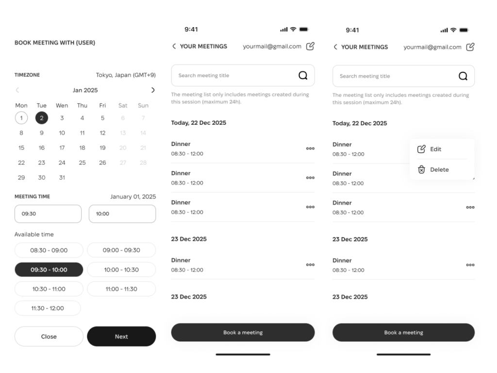 For those who want to share this new smart scheduling interface, please note that it is only available through the shareable web link, it is not available if you send your friends a Line OA link and the experience is web-only (not yet inside the AIAvatar app). In our next version, we’ll expand this feature so you can schedule through both call/chat and the in-app interface in AIAvatar.
